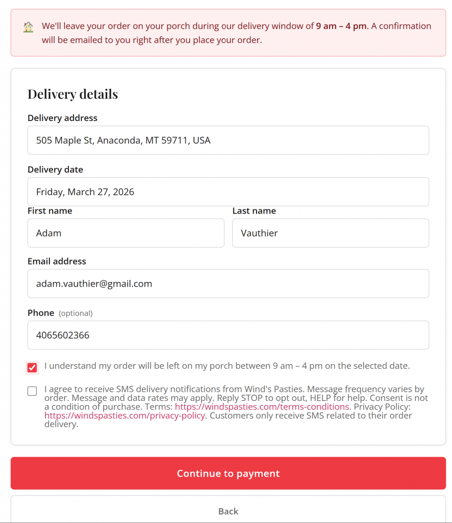 Customers may optionally opt in to receive transactional SMS delivery notifications from Wind’s Pasties during checkout. Consent is collected through a separate, unchecked checkbox on the checkout page. SMS messages are only sent after a customer places an order and explicitly opts in. Message frequency varies by order. Message and data rates may apply. Reply STOP to opt out and HELP for help.